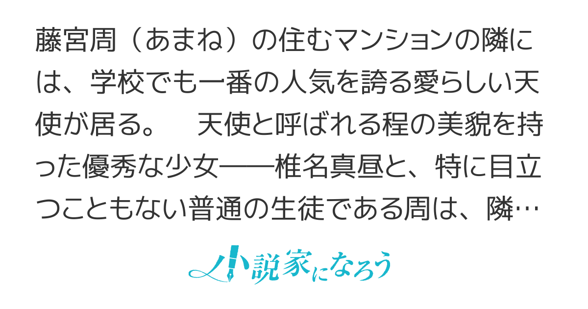 高校生の藤宮周が住むマンションの隣には、「天使様」と呼ばれる学校で一番の美少女・椎名真昼が住んでいる。特に関わり合いのなかった二人だが、雨の中ずぶ濡れになっていた彼女に傘を貸したことから、不思議な交流が始まった。自堕落な一人暮らしを送る周を...