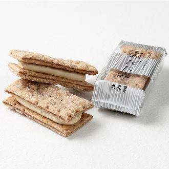 初霜が降りた朝、地面を踏みしめた時のあの音、あの感触。パイを食べた瞬間の「サクッ」とした食感とイメージを重ね、『霜だたみ』と名付けました。サクサクに焼き上げたチョコレートパイで当社特製モカホワイトチョコクリームをサンドしています。