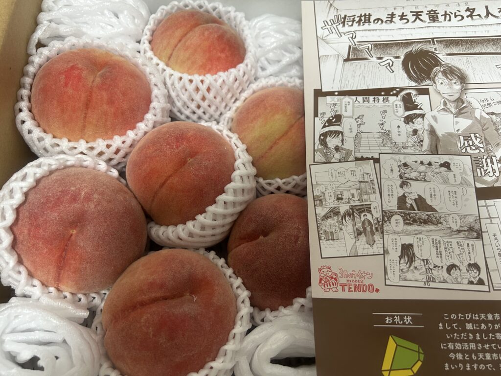 ここの桃の返礼品は「山形県天童市」で、「三月のライオン」の舞台にもなった場所なんです。返礼品を注文した後に、アンケートに答えるとグッズをもらえるという内容のメールが天童市から届きました。