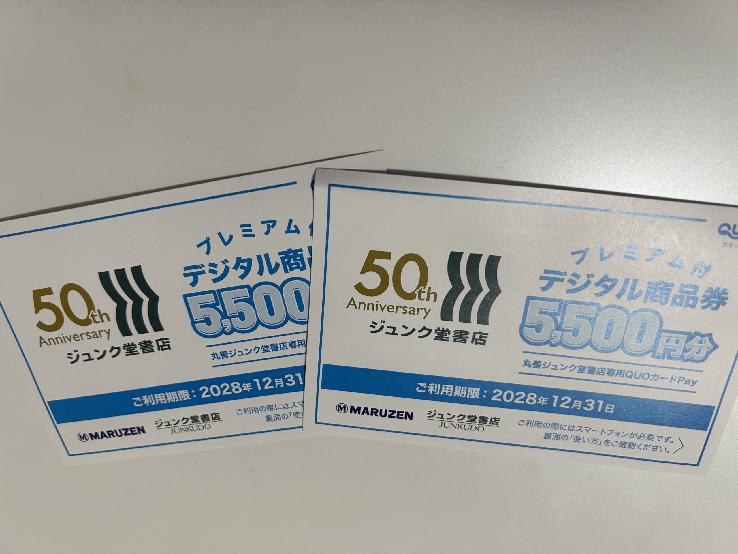 ジュンク堂書店創業50周年を記念して、5,500円分のデジタル商品券を5,000円で購入することが出来ます。500円お得ですね!一人4枚まで購入可能で、購入時の支払い方法は現金のみとなっています。