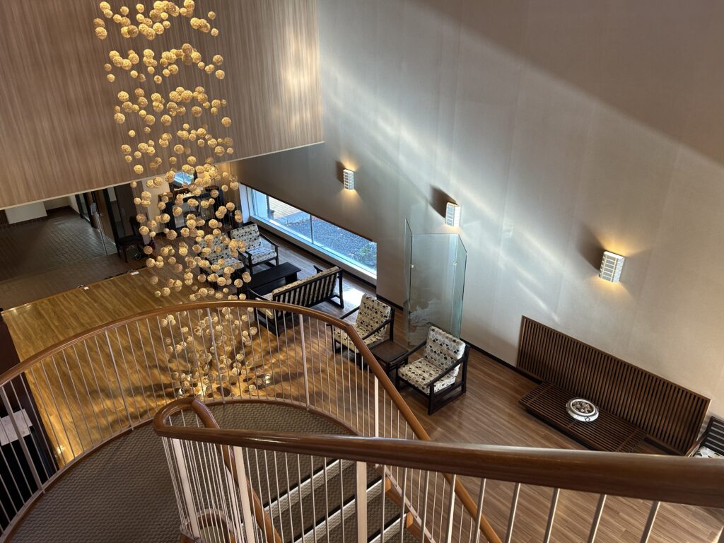 目の前に広がる大きな窓からの景色と、静かで薄暗い空間がとっても良かったです。